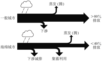 【題目】 《國(guó)家新型城鎮(zhèn)化規(guī)劃(2014~2020年)》明確提出,建設(shè)具有自然積存、自然滲透、自然凈化功能的海綿城市是今后我國(guó)城市建設(shè)的重大任務(wù)。在海綿城市的建設(shè)過程中,有關(guān)專業(yè)人員探索了低影響開發(fā)雨水系統(tǒng),取得良好效果。低影響開發(fā)雨水系統(tǒng)指的是在城市建設(shè)過程中,通過生態(tài)化措施,盡可能維持城市建設(shè)前后水文特征不變,有效緩解不透水面積增加造成的徑流總量、徑流峰值與徑流污染的增加對(duì)環(huán)境造成的不利影響。下圖示意一般城市和海綿城市雨水排放系統(tǒng)。