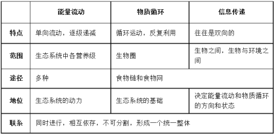 任何一個(gè)生態(tài)系統(tǒng)都具有能量流動(dòng)、物質(zhì)循環(huán)和信息傳遞,這三者是生態(tài)系統(tǒng)的基本功能。能量流動(dòng)、物質(zhì)循環(huán)和信息傳遞的比較如下表: